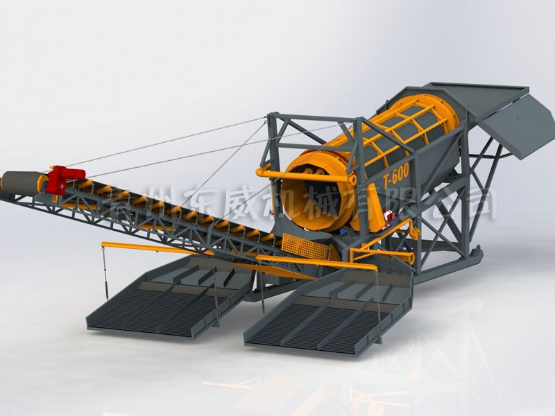 設(shè)備由料倉、滾筒篩、固定溜槽、鼓動(dòng)溜槽、尾料輸送機(jī)、水泵組等系統(tǒng)組成,通過電機(jī)或柴油機(jī)驅(qū)動(dòng)滾筒篩及其他水泵系統(tǒng),供水量可根據(jù)原料情況通過閥門調(diào)節(jié)水量大小。