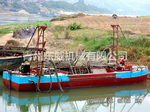 該抽沙設備主要適用于水庫、河道、湖泊等寬車輛不能進入的闊水域作業(yè),工作流程為抽沙運輸船開到抽沙區(qū)域,利用抽沙船自帶的抽砂系統(tǒng)將沙子抽進船艙,抽滿船艙后運輸至岸邊,打開底艙門,將沙子卸到水里,再用岸邊的小型抽沙機抽出并輸送至碼頭或者直接用抽砂泵講沙子從船艙輸送至碼頭。該設備結構簡單、工作量大、易損件少,抽出來的沙子含泥量低,無石塊,沙子質量好,是近幾年采沙、清淤比較常用的工具。